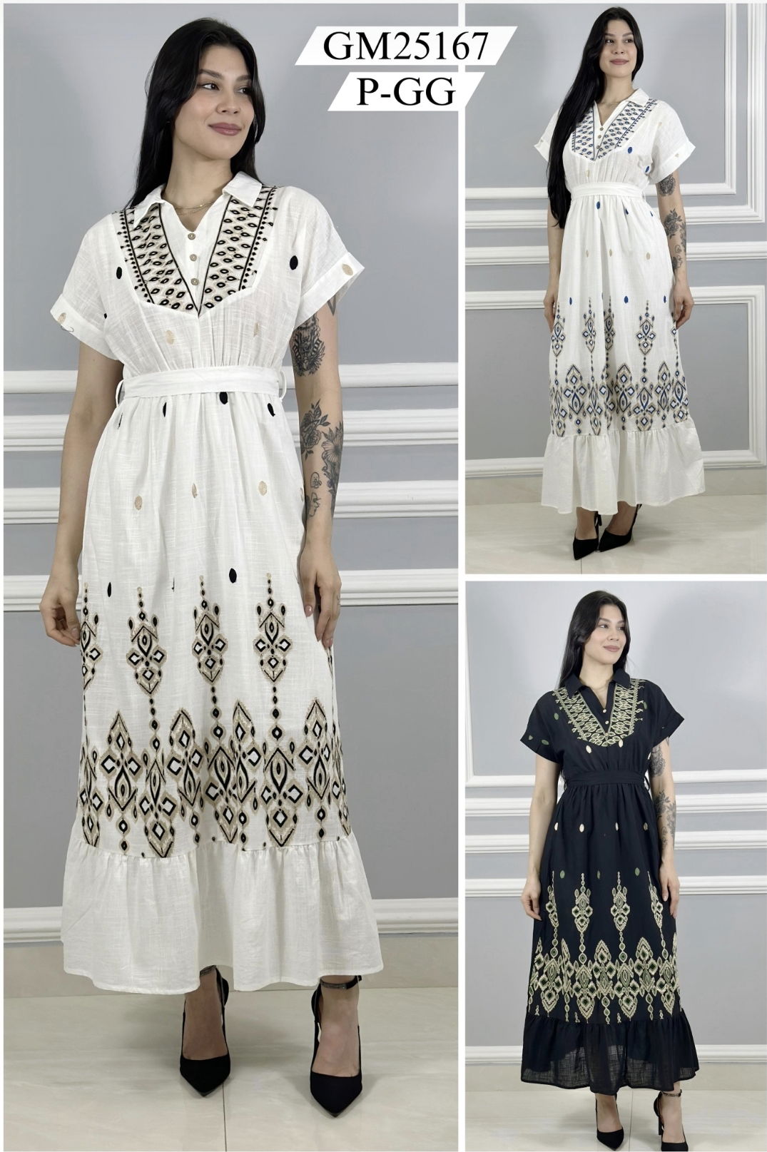 Vestido Bordado de Lino Cuello Camisero